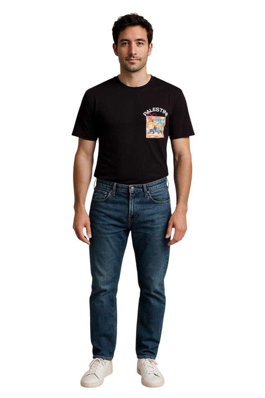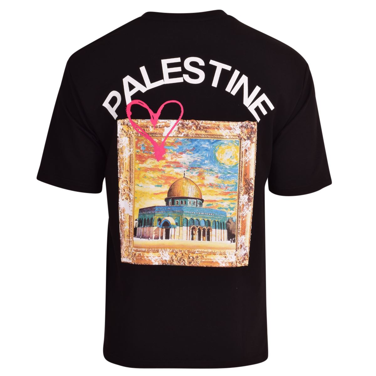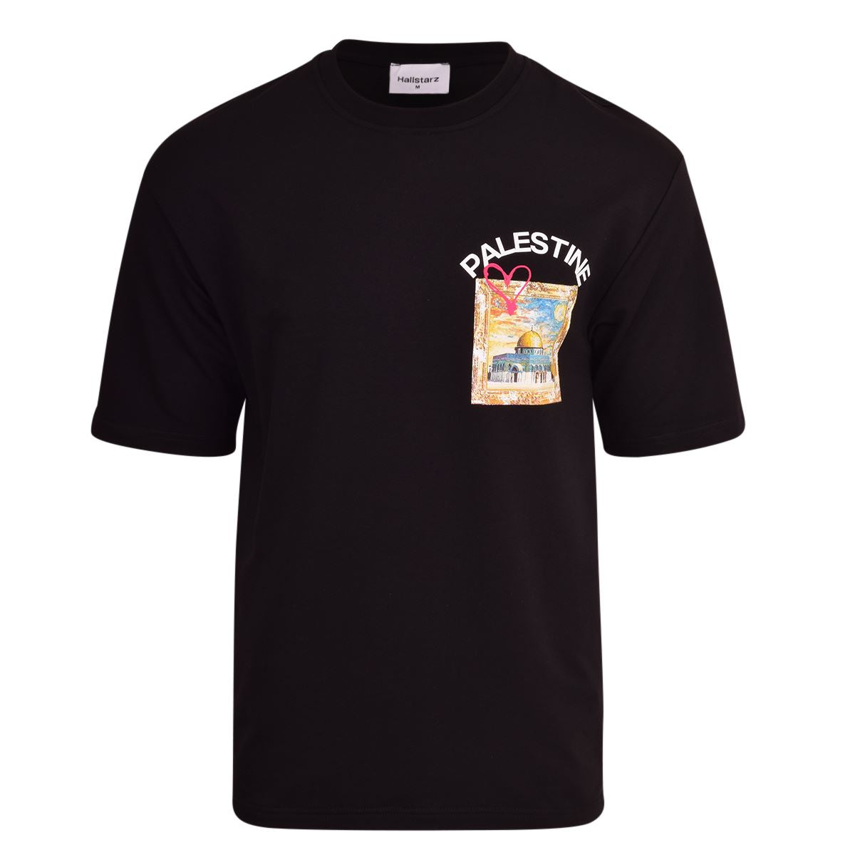 Palestine Graphic T-Shirt for Men  Black Tee with Dome of the Rock Print and Heart Design  Comfortable Short Sleeve Casual Top