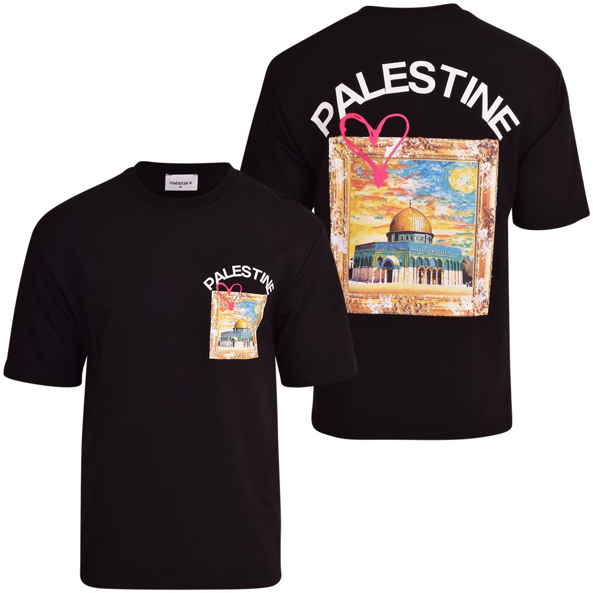 Palestine Graphic T-Shirt for Men Black Tee with Dome of the Rock Print and Heart Design Comfortable Short Sleeve Casual Top