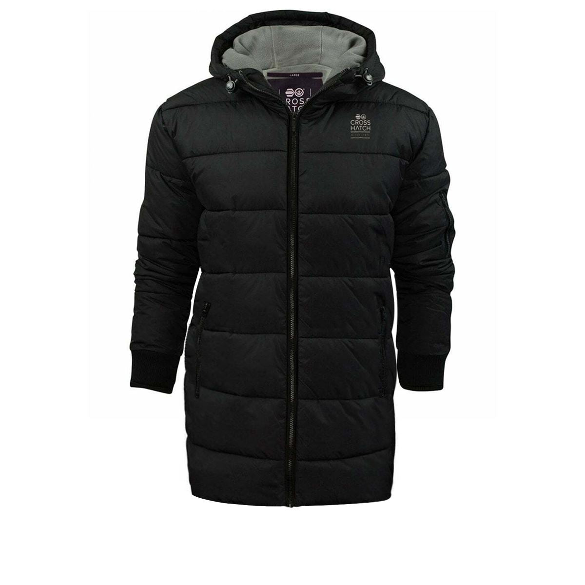 Crosshatch Mens Fleece Lined Long Length Coat Quilted Padded Warm Winter Hooded Jacket Zip Pockets Inside Pocket