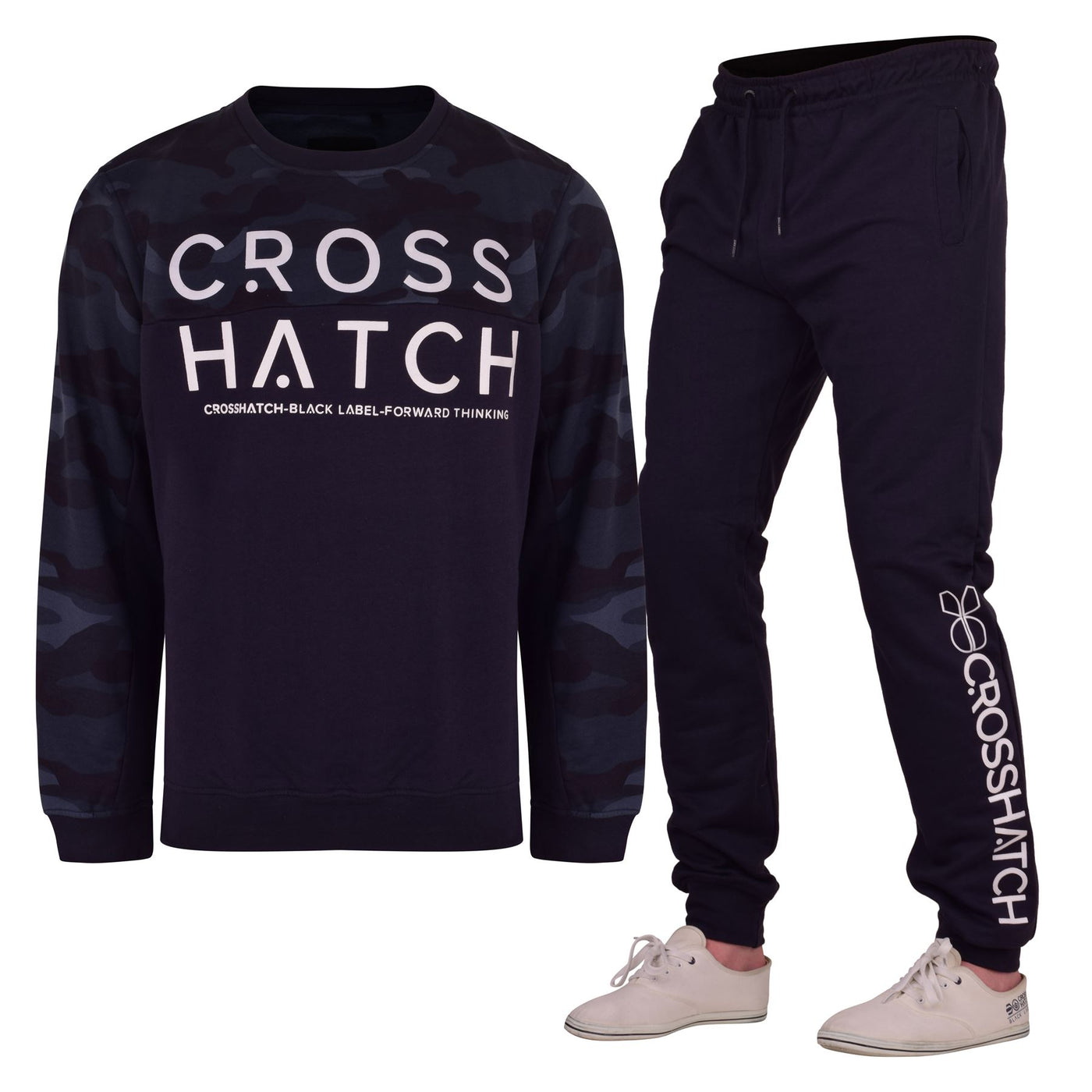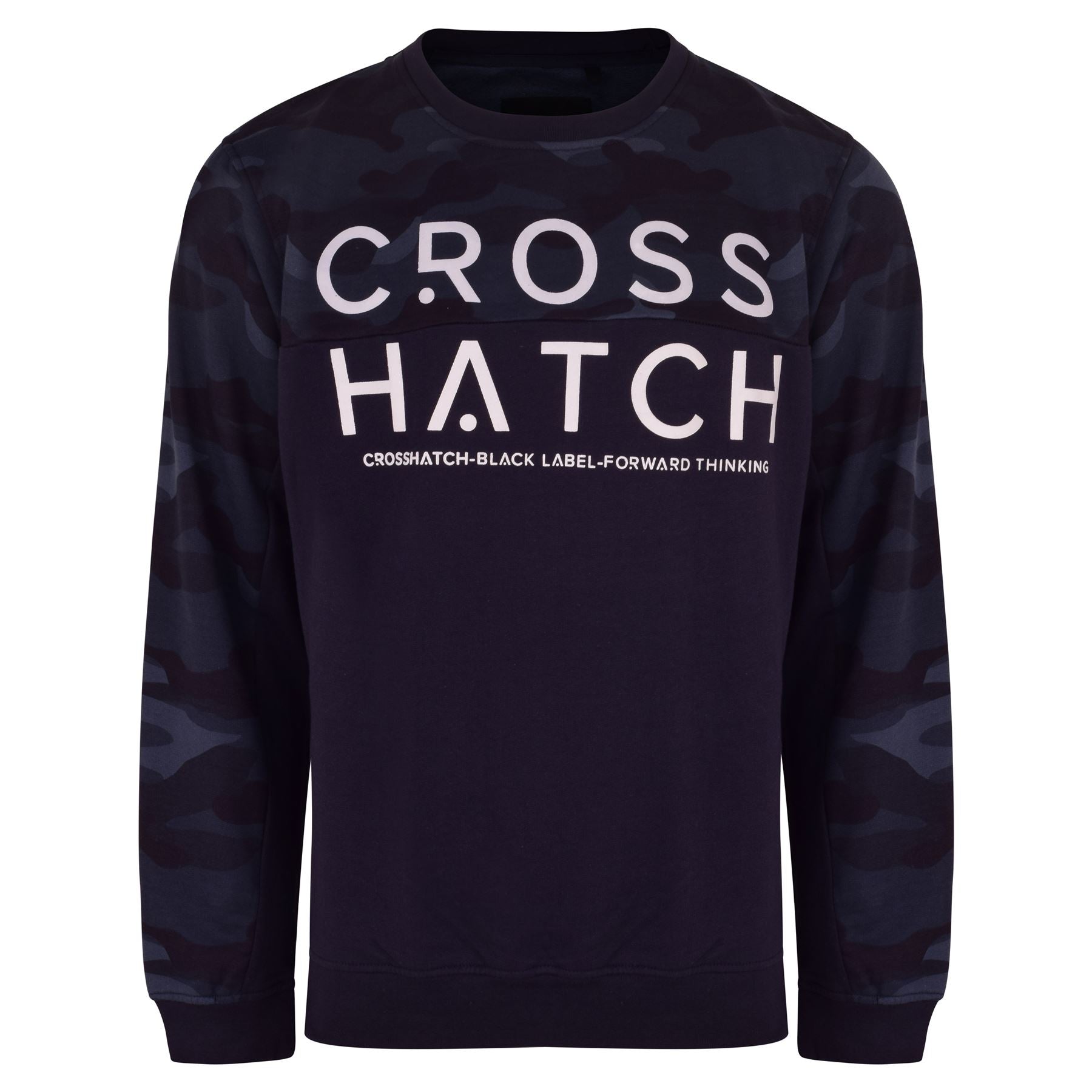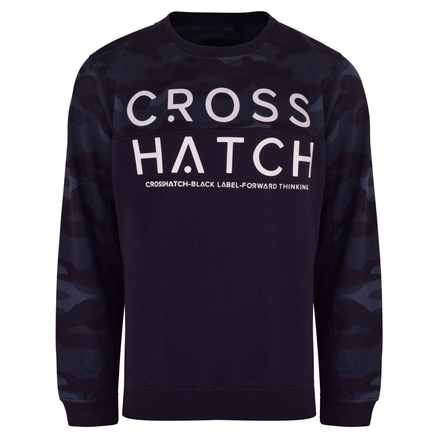 Crew neck sweatshirt with cut & sew camo printed upper body panel and sleeve
